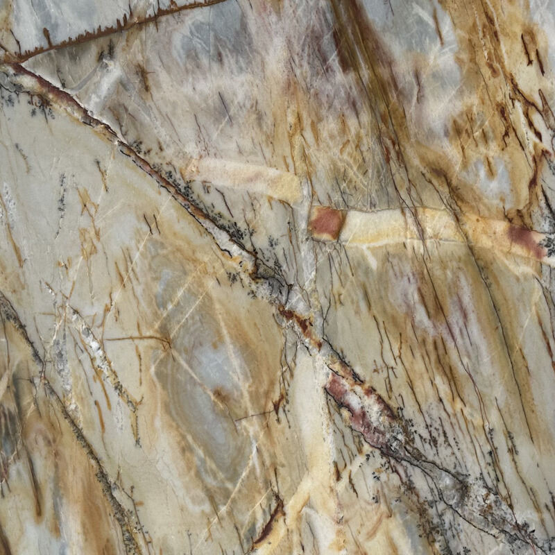 Cosmopolitan Quartzite is a durable natural stone with neutral tones, accented by patterns of rust, gold, and grey. Its strength and heat resistance make it ideal for countertops, walls, and flooring in both homes and commercial spaces.