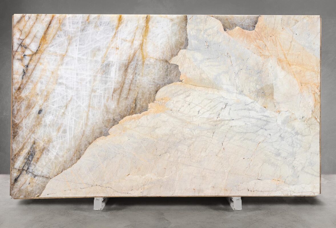 - The primary base color of Patagonia Quartzite varies, but it predominantly showcases a neutral to warm light beige or off-white tone. Sometime, light background is overlaid with hints of soft grey or ivory, giving the stone a clean yet natural backdrop