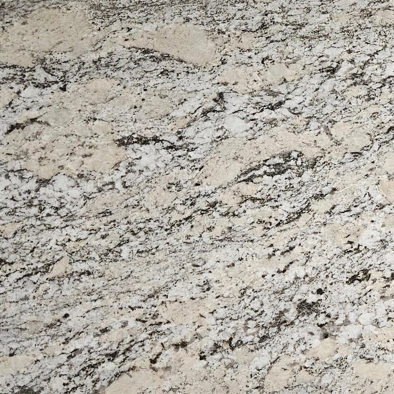 - Color: Aspen White Granite features a creamy white base with flowing patterns of grey and charcoal. Subtle black mineral flecks add depth, while the soft movement of the veining brings life to the surface.
